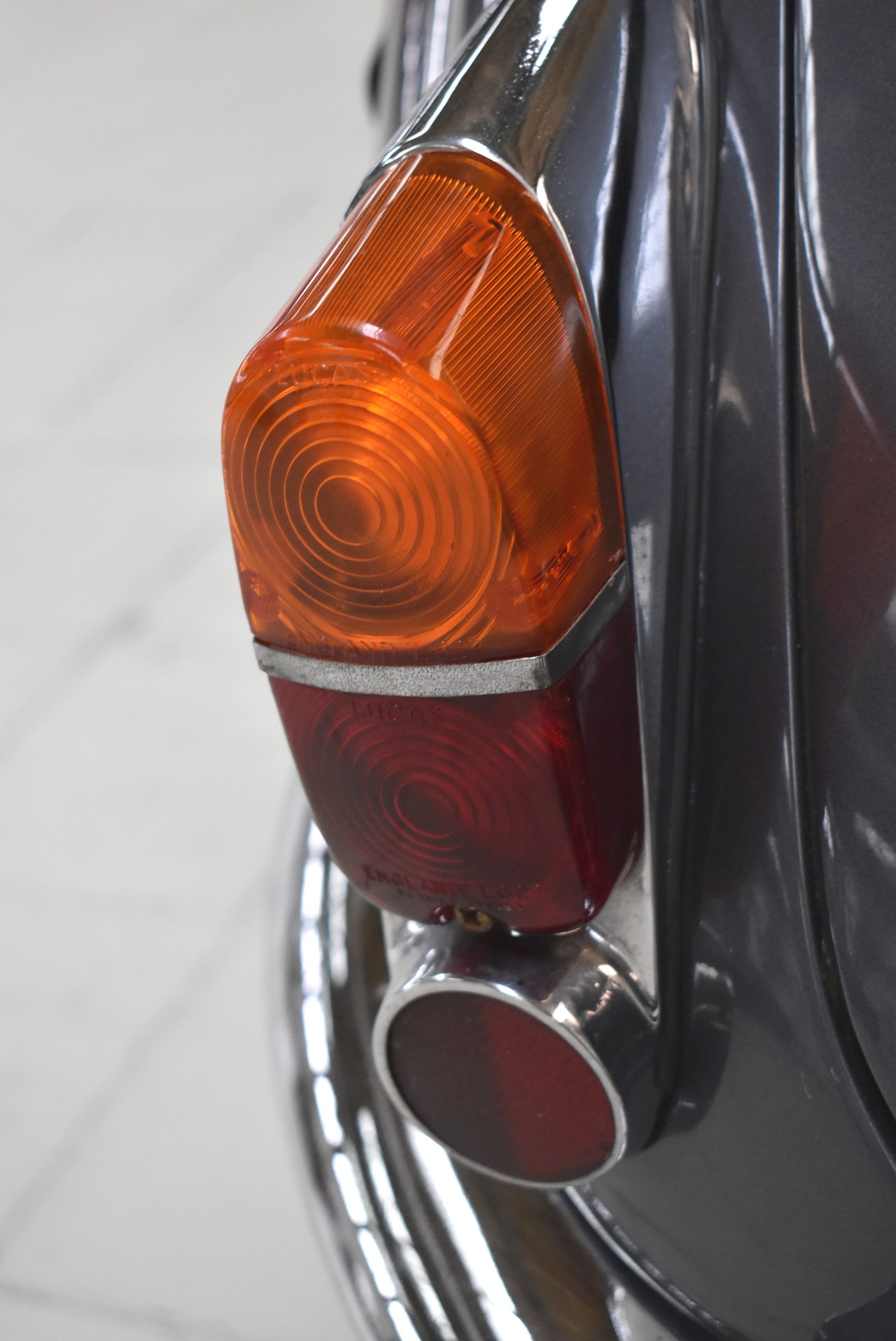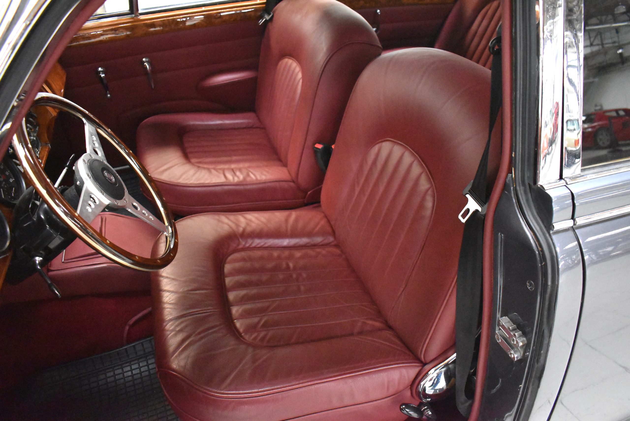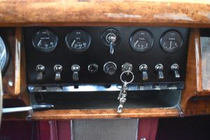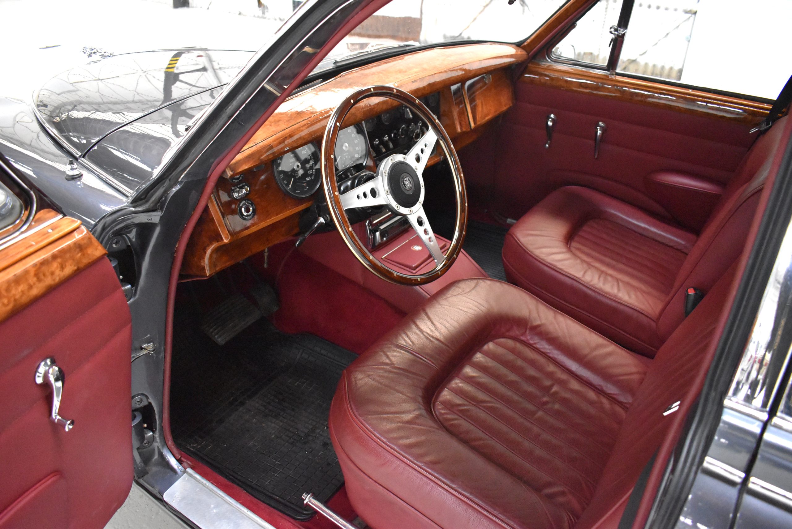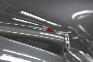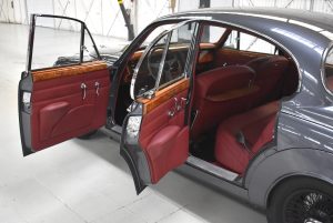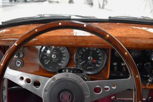 Originaler Linkslenker, Lackierung in Gunmetal Grey mit sehr schönem roten Leder innen, schwarz lackierte Speichenräder mit Zentralverschluß – englischer und sportlicher geht es kaum.